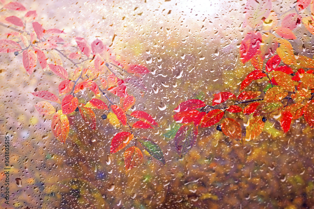 autumn rain, view of the blurred autumn park from the window, raindrops on the window pane, red, yellow leaves on a tree branch in the rain, autumn background