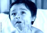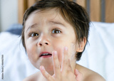 Closeup face of little boy applying body lotion cream on his cheek after shower,Kid using cream for skincare protection,Child moisturize his dry skin, Children problem,hygiene,clean and fresh concept