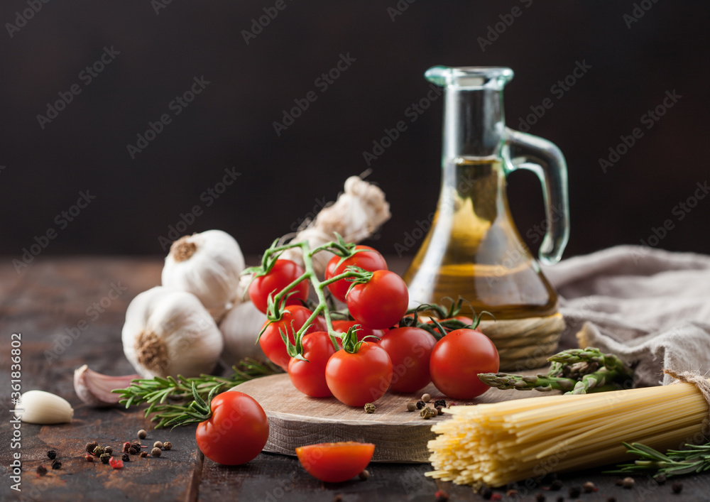 Raw spaghetti pasta with cherry tomatoes, olive oil with garlic and rosemary on wooden background.