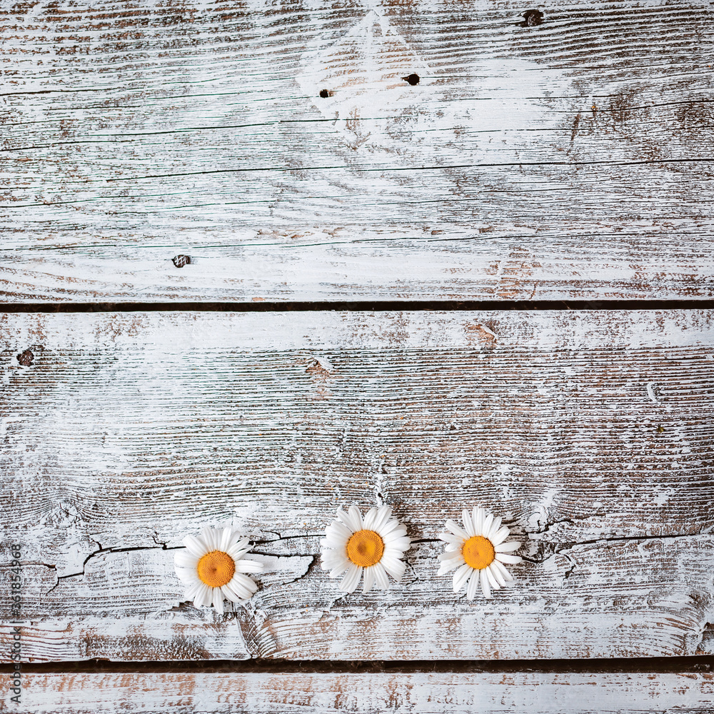 Chamomile flowers white old wooden background.