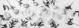 Rose wine variety layout. Flat-lay of rose wine in various glasses and summer blooming peony flowers over white background, top view. Summer drink for party, wine shop or wine tasting concept