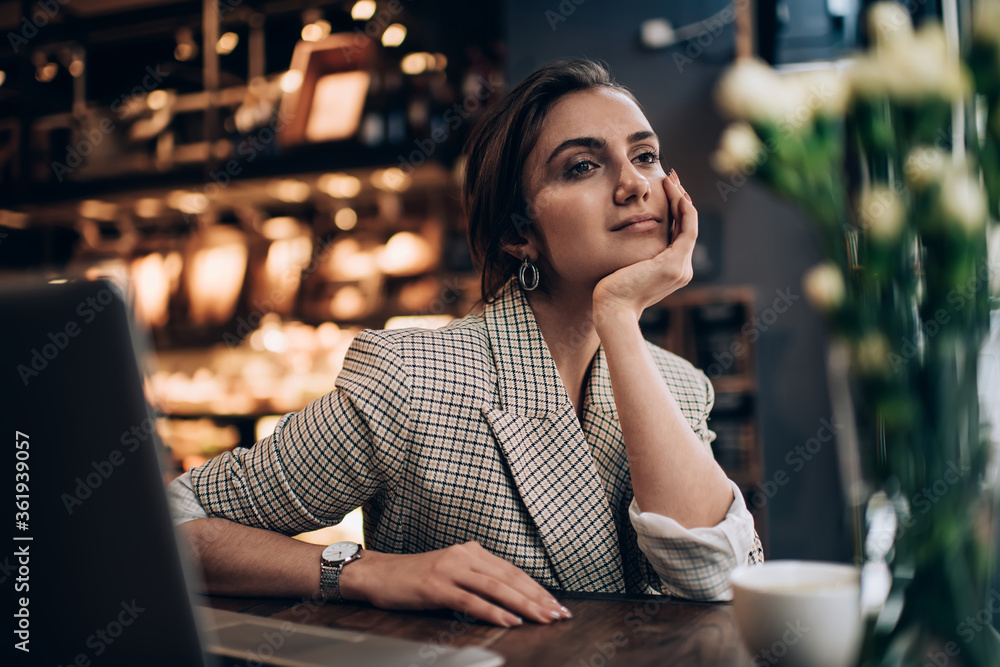 Contemplative female freelancer thoughtful looking away pondering on project idea for create during distance job in cafe interior, pensive woman thinking at table with portable laptop computer