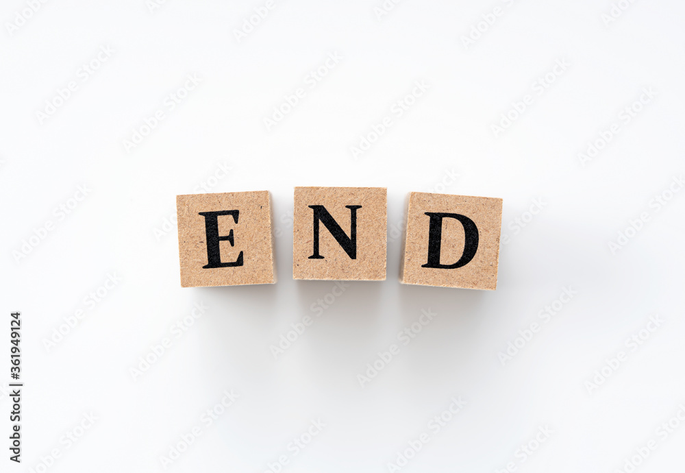 A wooden block with the word END written on it on a white background