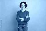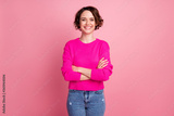 Photo of pretty attractive cheerful lady self-confident person arms crossed good mood wear casual sweater pullover jeans isolated pink pastel color background
