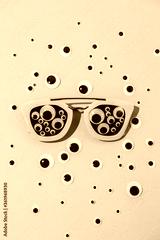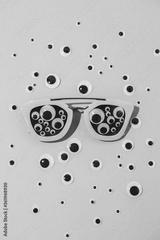 Psychedelic and surreal plastic glasses with lots of eyes and among of another cartoon eyes on pink pop art background.