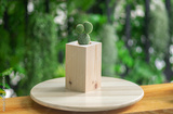 cactus plants in diy a piece of wood pot tube shape against green background is on wooden table