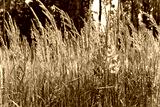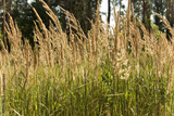 Grass with yellow spikelets. Background from yellow plants and green pines. Street vegetation in the green zone. Summer sunny day.