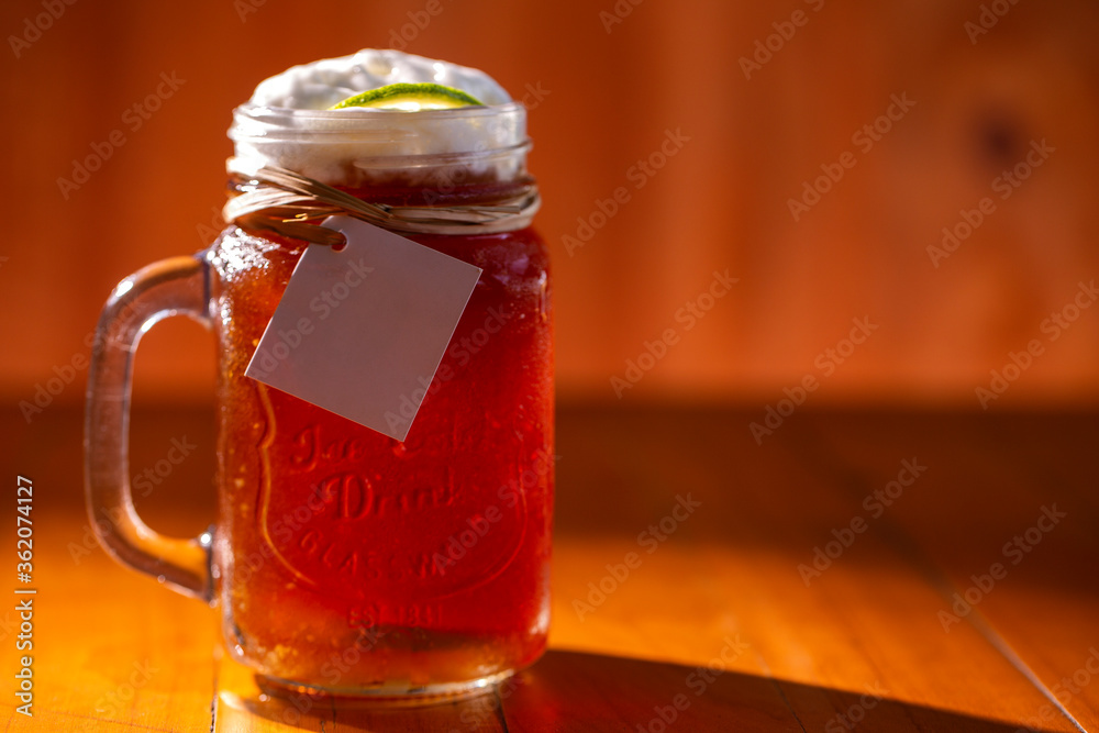 Dietary detox drink with red fruit in clean water and a fresh red fruit on a wooden table, close up.
