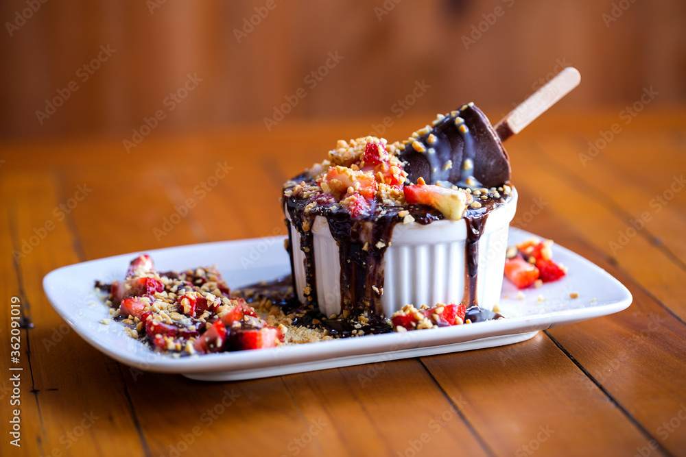 Grand gateau. Ice cream, chocolate and strawberry on wood background.