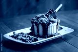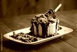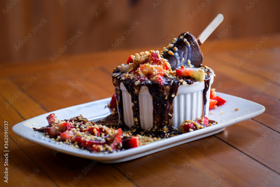 Grand gateau. Ice cream, chocolate and strawberry on wood background.