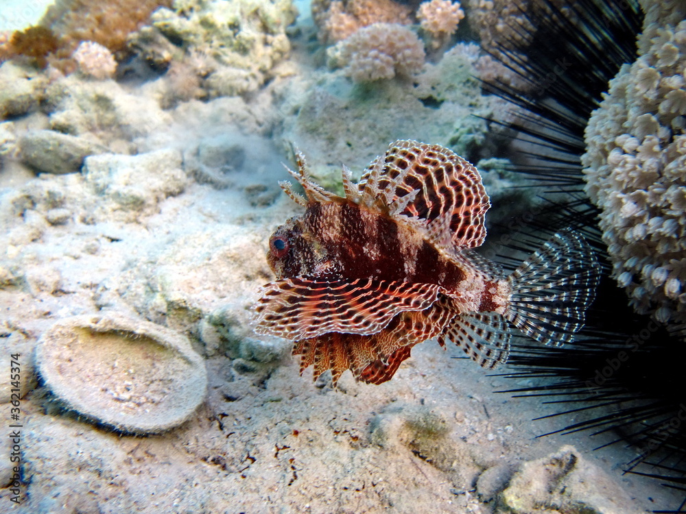 Scorpaenidae. The short-finned dendrochir grows up to 12 cm. This small scorpionfish has an unusual appearance and is very beautiful with bright fins set apart in an unusual cruciform shape in profile