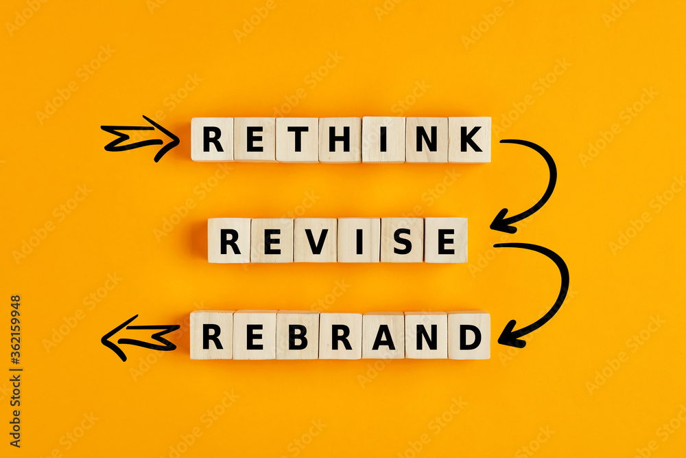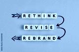 Business branding concept of rethink revise and rebrand words on wooden cubes with process arrows