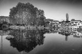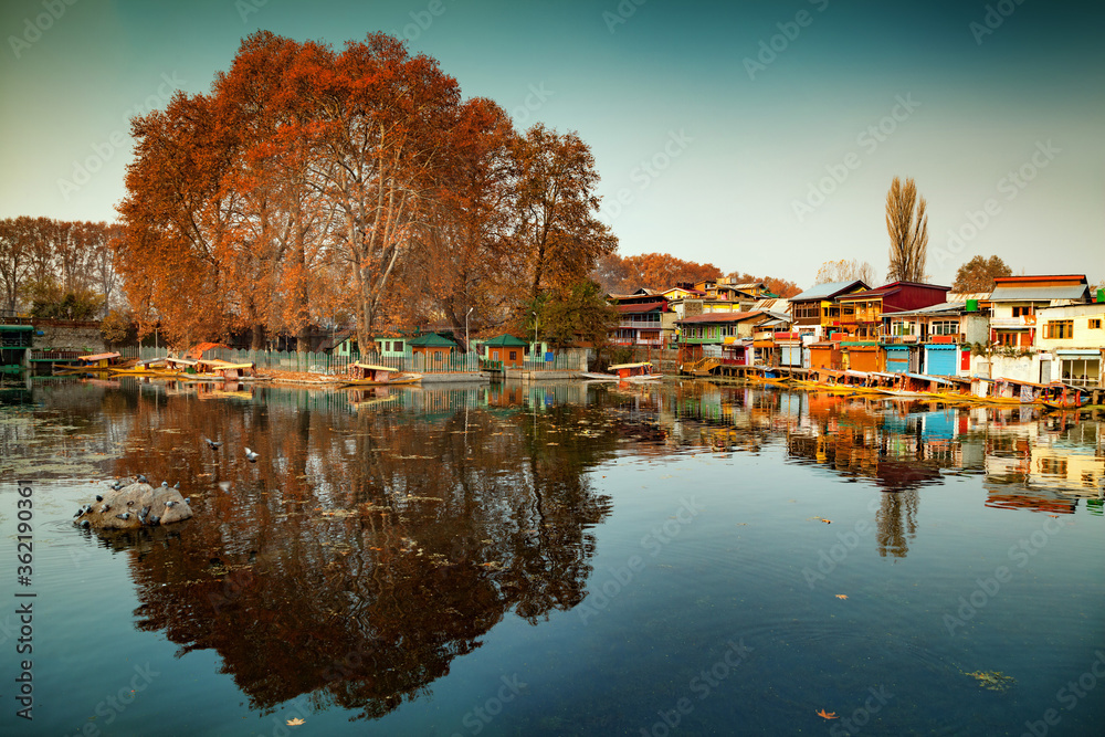 A picturesque view of several Shikara boats parked at jhelum riverside in Srinagar, Jammu and Kashmir, India