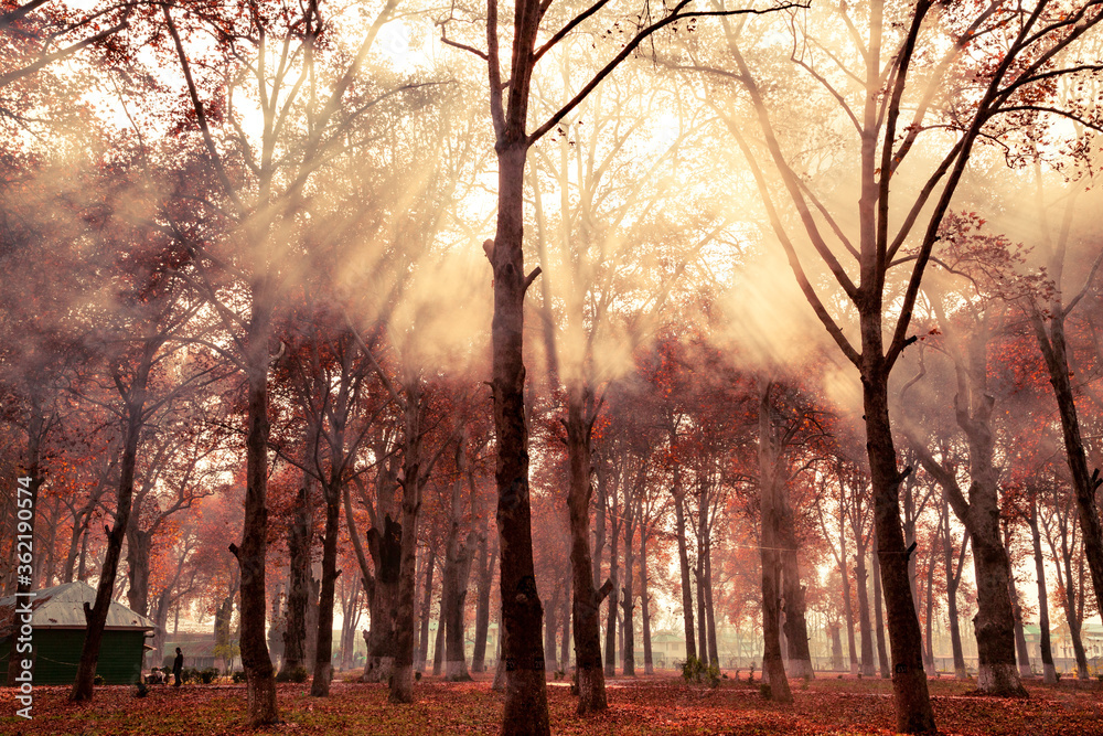 Morning sunrays refreshen maple tree surrounding inside Kashmir