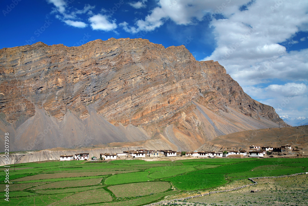 Fields in Spiti Valley in Himalayas. Himachal Pradesh, India