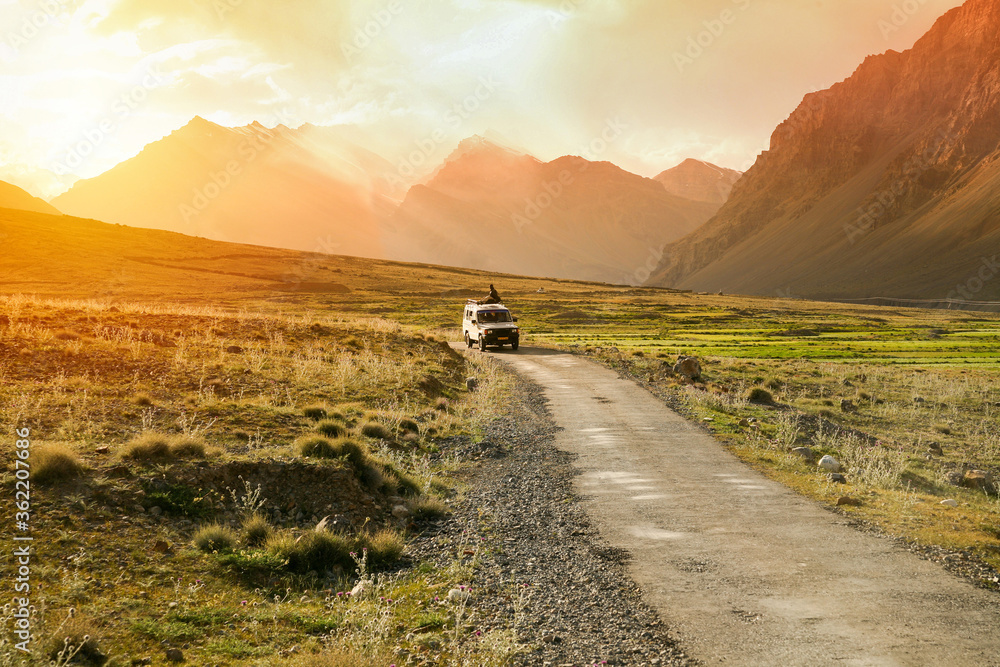 Off-road vehicle driving in the Indian Himalayas in Spiti Valley, Himachal Pradesh, India.