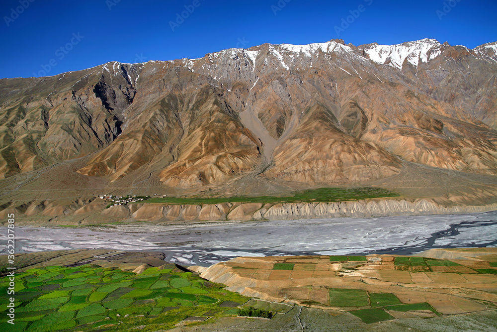 Fields in Spiti Valley in Himalayas. Himachal Pradesh, India