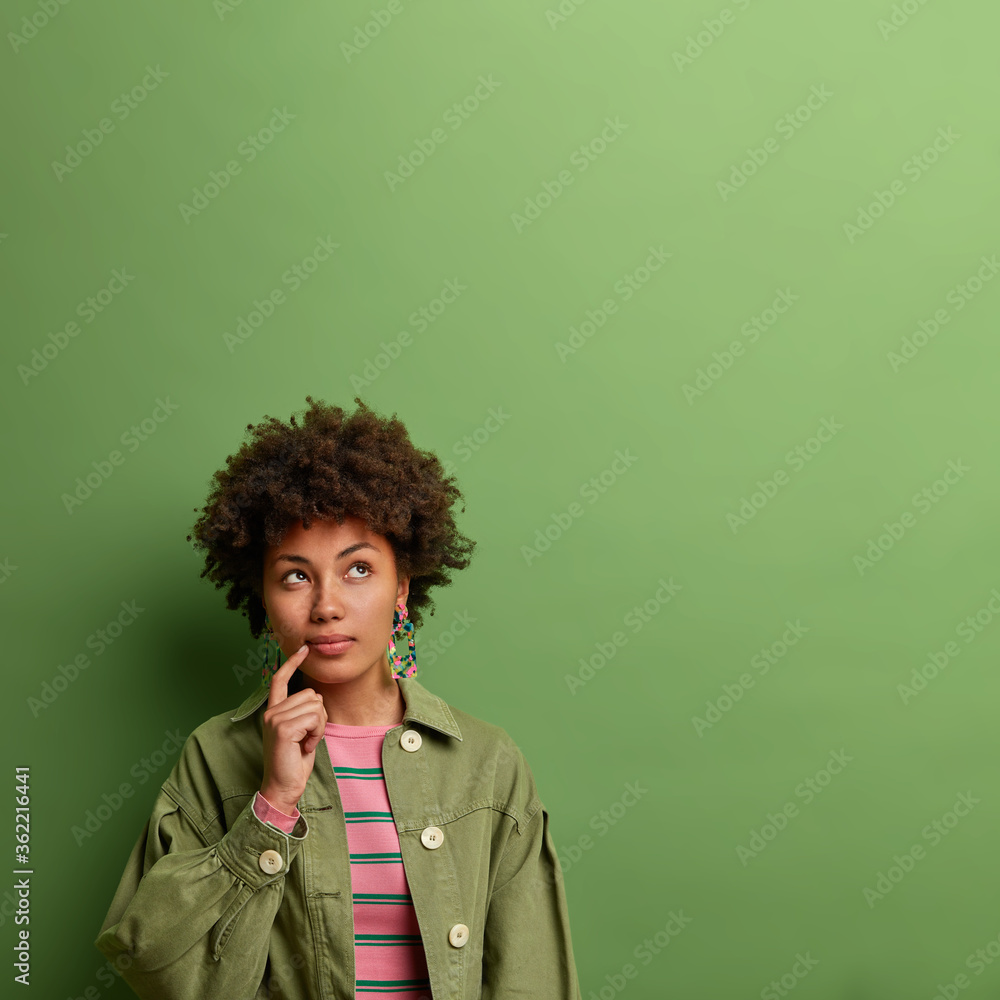 Vertical shot of curly haired young woman with thoughtful expression, keeps finger near lips, dressed in fashionable jacket, poses against green background, copy space for your advertisement
