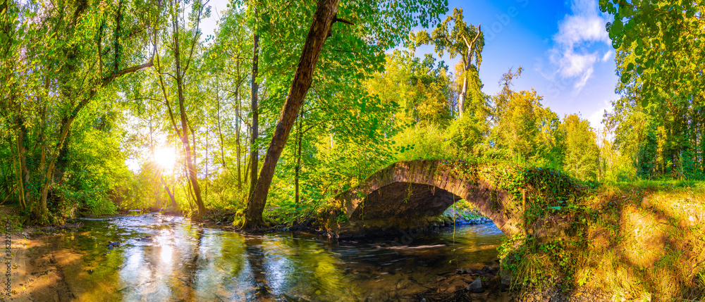 Forest panorama in the bright light of the sun, with an old bridge over a stream