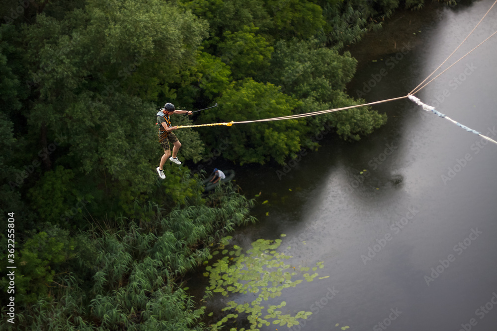 Concept of Extreme Sports and Fun. The man is a thrill-seeker and a rope jumper from the bridge. He is very happy to make a dream come true. He is holding an action camera and insanely happy
