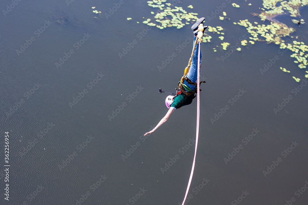 Ivanovsky Bridge, Ukraine - June 21, 2020: Concept of Extreme Sport. The girl is doing rope jumping from the bridge. She is very happy to make a dream come true. She is holding an action camera