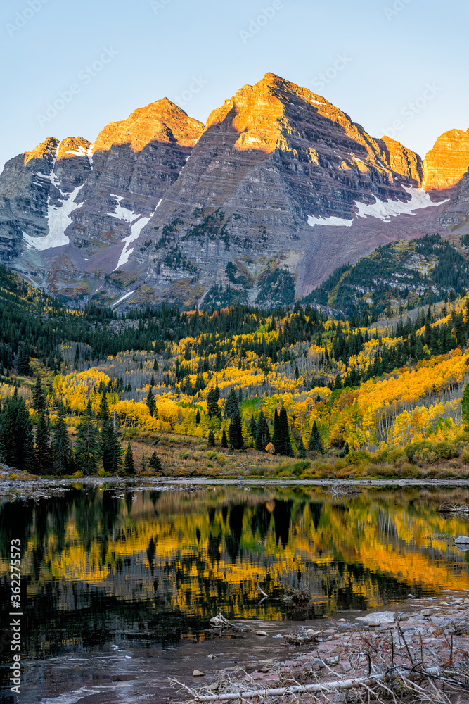 Maroon Bells lake at sunrise in Aspen, Colorado with rocky mountain peak and snow in October 2019 autumn and vibrant trees reflection on water vertical view