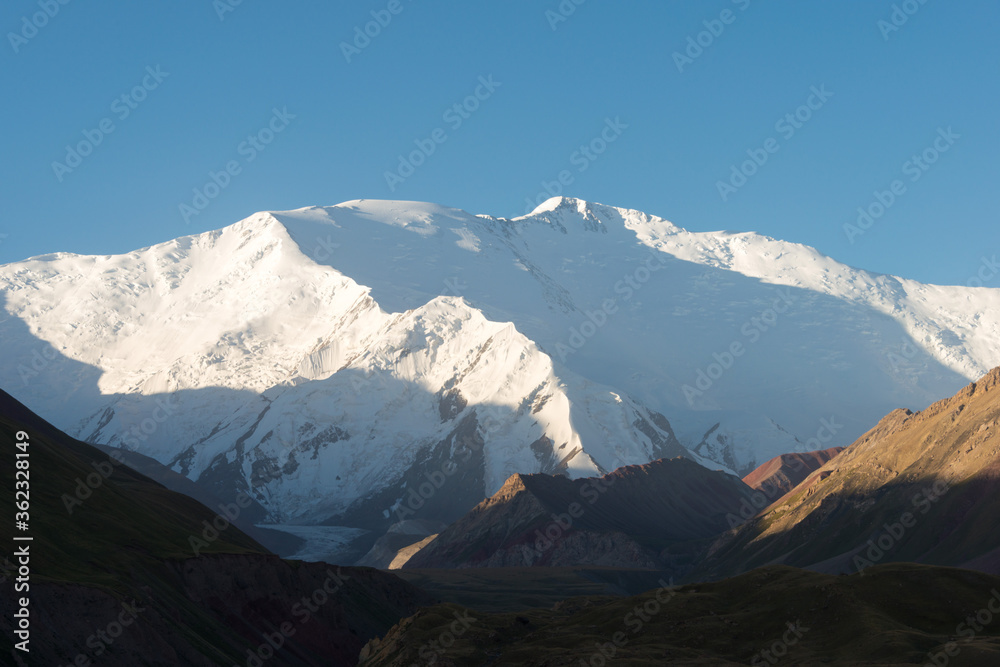 Morning Sunlight Landscape of Lenin Peak (7134m) in Osh, Kyrgyzstan. Pamir mountains in Kyrgyzstan.