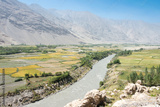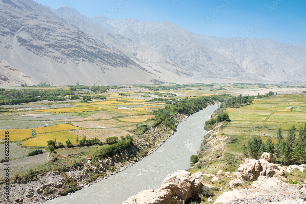 Afghanistan at Wakhan Valley View from Khaakha Fortress in Ishkashim, Gorno-Badakhshan, Tajikistan. It is located in the Tajikistan and Afghanistan border.