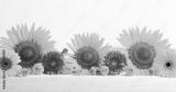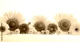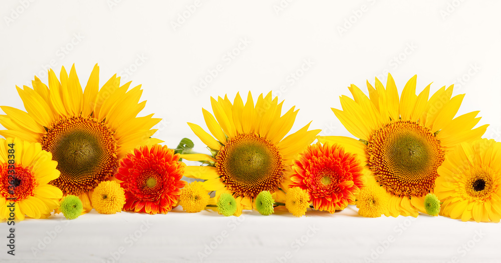 Beautiful autumn still life with sunflowers, red- yellow flowers on wooden table, front view. Autumn concept with flowers.