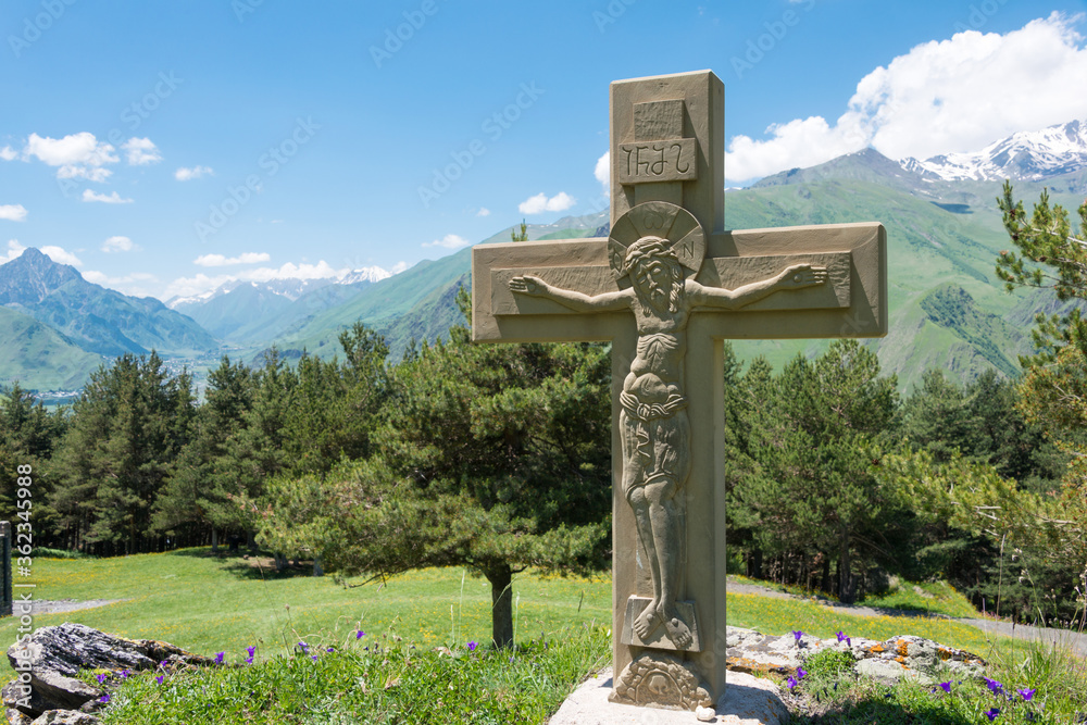 Orthodox cross at St. Elias the Prophet Church in Kazbegi, Mtskheta-Mtianeti, Georgia.