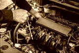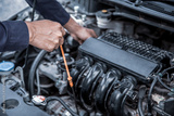 Auto mechanic checking vehicle’s engine oil level to changing car engine oil concepts of maintenance repair service and car insurance.