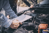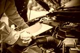 Auto mechanic using checklist for car engine systems after fixed. concepts of car insurance support and services.