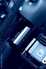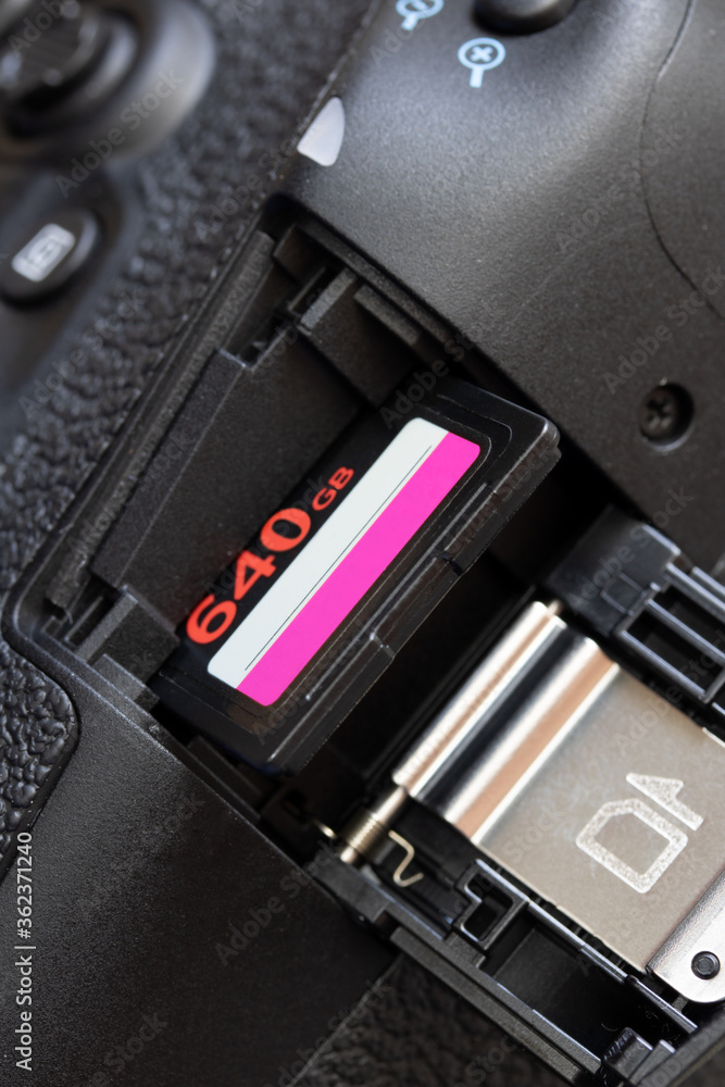 The memory card with large capacity in camera slot. The memory card inserted to card hole in open door of the digital camera.