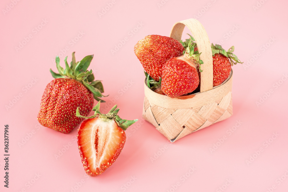 Fresh red strawberries. piled up high and filling a small woven basket on a pink background.