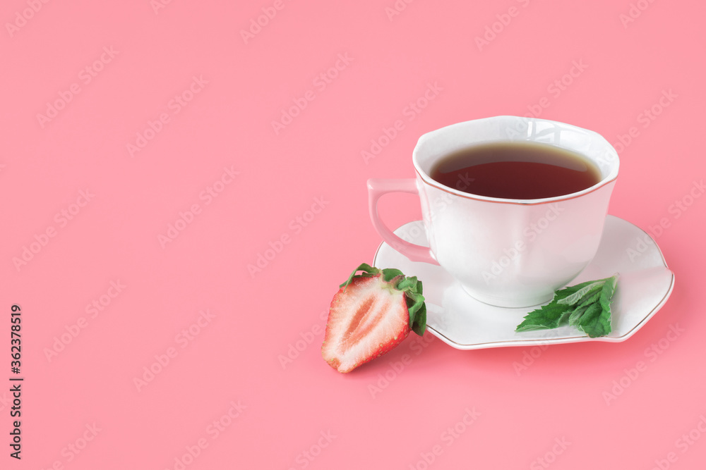 Tea with strawberries and mint. Cup of tea on a white saucer with mint leaves and ripe strawberries. pink background. copyspace.