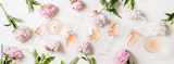 Rose wine variety layout. Flat-lay of rose wine in glasses and summer peony flowers over white background, top view. Summer drink for party, wine shop or wine tasting concept