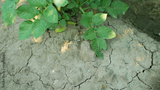 Drought dry field land with potato leaves Solanum tuberosum potatoes, drying up the soil cracked, climate change, environmental disaster and earth cracks, degradation agricultural problem harvest