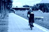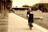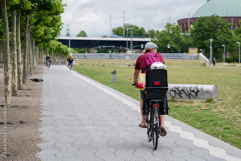 Mother and her kid on child seat, ride bicycle on bicycle lane on promenade riverside of Rhein River in Düsseldorf, Germany. Cycling friendly city in europe.