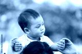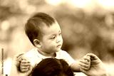 Asian boy is riding his mother's neck.