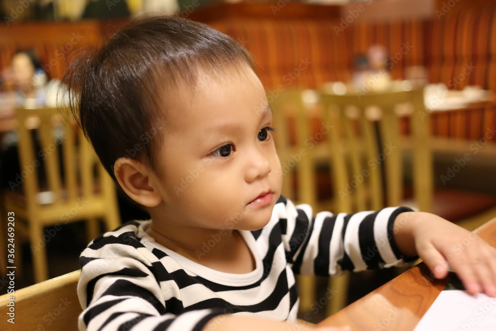 An Asian boy is sitting intently and waiting for food.