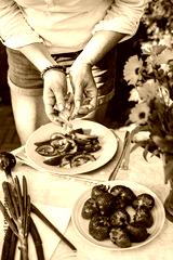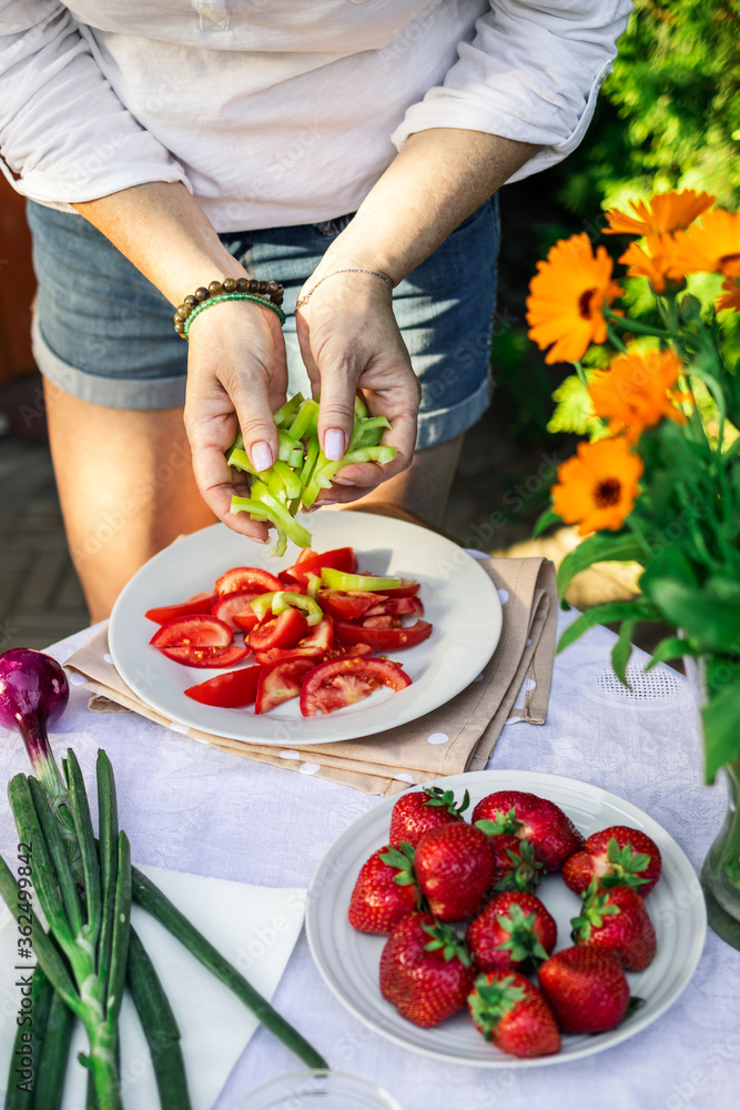 Woman making fresh vegetable salad from peppers and tomatoes outdoors. Red strawberry on plate at dining table. Preparing vegetarian food for garden party