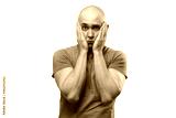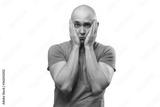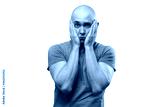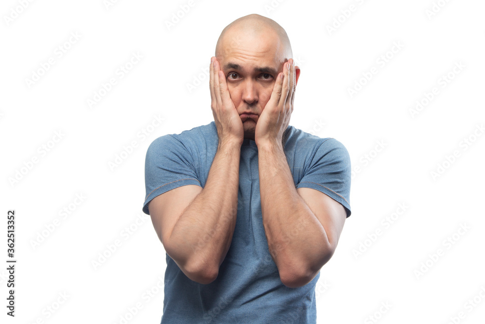 Image of young bald man with problems in blue tee shirt
