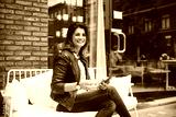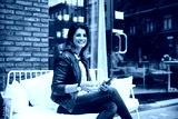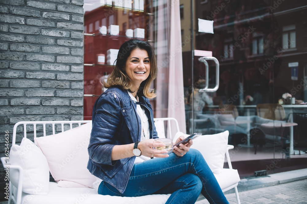 Happy woman surfing smartphone in street cafe