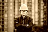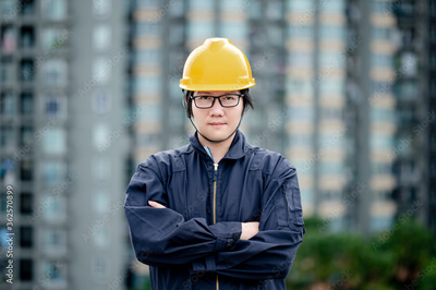 Asian maintenance worker man wearing protective suit and safety helmet working at construction site. Civil engineering, Architecture builder and building service concepts