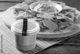 Guacamole avocado, lime, tomato, onion and cilantro, served with nachos - Traditional Mexican snack.