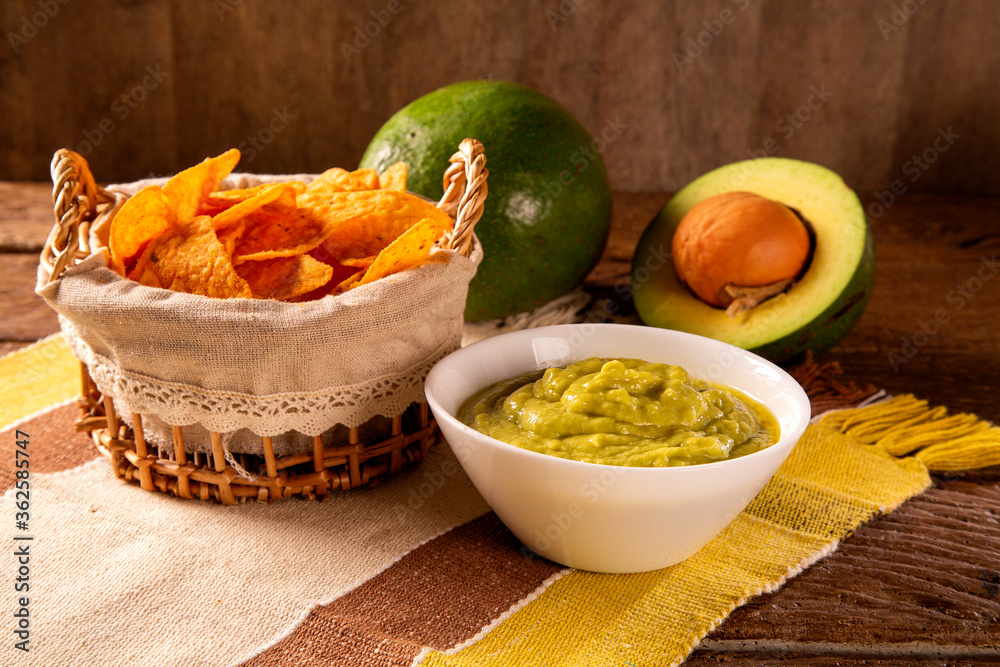Guacamole avocado, lime, tomato, onion and cilantro, served with nachos - Traditional Mexican snack.