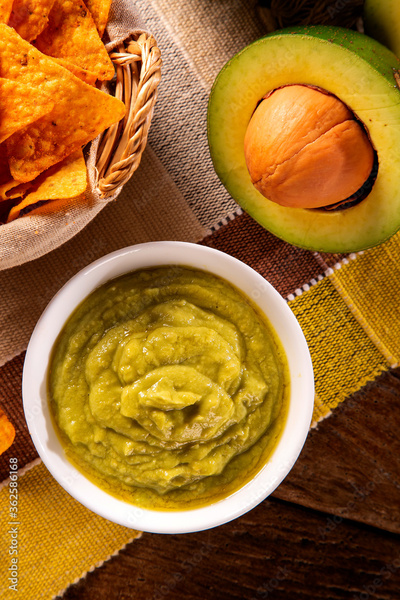 Guacamole avocado, lime, tomato, onion and cilantro, served with nachos - Traditional Mexican snack.
