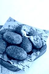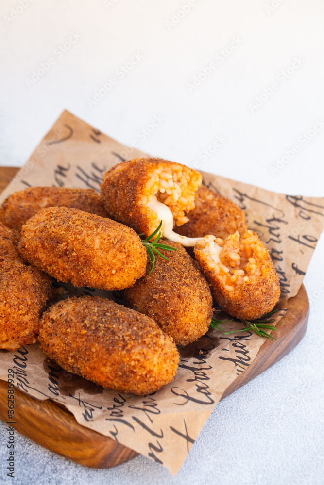 Supplì - italian snacks consisting of rise with tomato sauce and mincemeat, filled with peace of mozzarella, soaked in eggs, coated with bread crumbs and deep-fried. Roman cuisine.