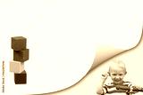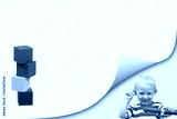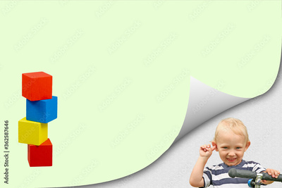 Smiling blond boy in bent corner of the page and colorful tower of wooden cubes on yellow blank paper ready for your use.