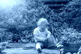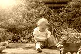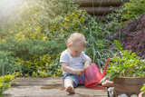 Cool little baby boy is playing with garden watering can sitting in the garden
